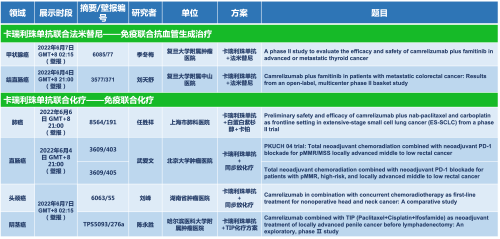卡瑞利珠单抗联合恒峰g22医药的另一款创新药法米替尼在甲状腺癌和结直肠癌领域有2项研究被接收为壁报,另有卡瑞利珠单抗联合化疗的4项研究在肺癌、结直肠癌、头颈癌和阴茎癌领域的研究被接收为5份壁报。